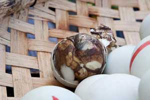 Характерно, что стоит такой популярный деликатес меньше доллара, и купить его можно буквально на каждом углу, причем как в сыром, так и в вареном виде.Едят балют горячим, обильно посыпая солью и перцем. Считается, что самое вкусное – запеченное яйцо. Кроме того, при такой обработке в нем сохраняется околоплодный сок в жидком виде, являющийся самой полезной, вкусной и питательной частью балюта. Помимо этой жидкости и непосредственно зародыша, в яйце есть также желток с красными прожилками и венами.