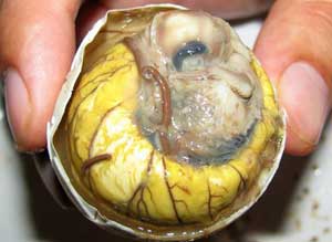 Вот только если вы решитесь попробовать это блюдо, путешествуя по Юго-Восточной Азии, помните, что есть его нужно правильно. Сначала следует очистить верхнюю часть яйца, затем посолить и обильно посыпать специями его содержимое, после чего полить соком лайма или специальным соусом. Только после этого можно выпить околоплодный сок. Что интересно, по вкусу он напомнит вам куриный бульон. Ну, а дальше очищайте яйцо до конца и приступайте к поеданию зародыша...