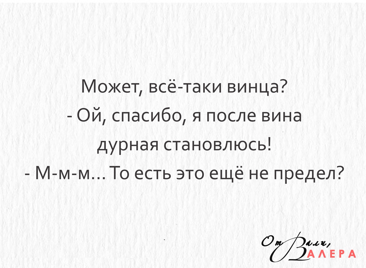 @Степлер, да, и вынуждена признать, что алкоголь мне на пользу не идет. Предметы и подарки Нравится Нравится 4 поблагодарили Шпилька за хорошее сообщение: Bell (02.07.2018), Ирис (02.07.2018), Степлер (02.07.2018), Шиххиртх (02.07.2018) Шпилька Посмотреть профиль Отправить личное сообщение для Шпилька Найти ещё сообщения от Шпилька